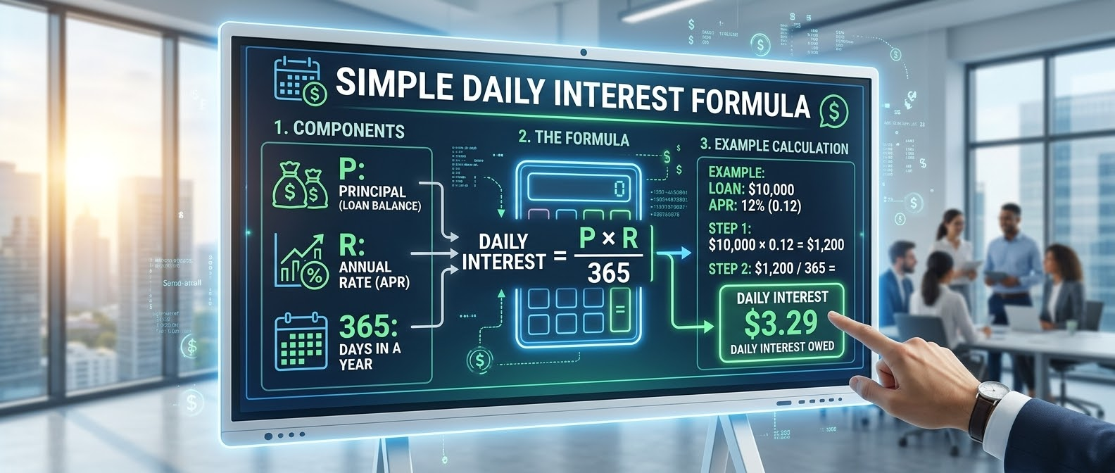 The formula is: (Principal Balance x Interest Rate) / 365 = Daily Interest.