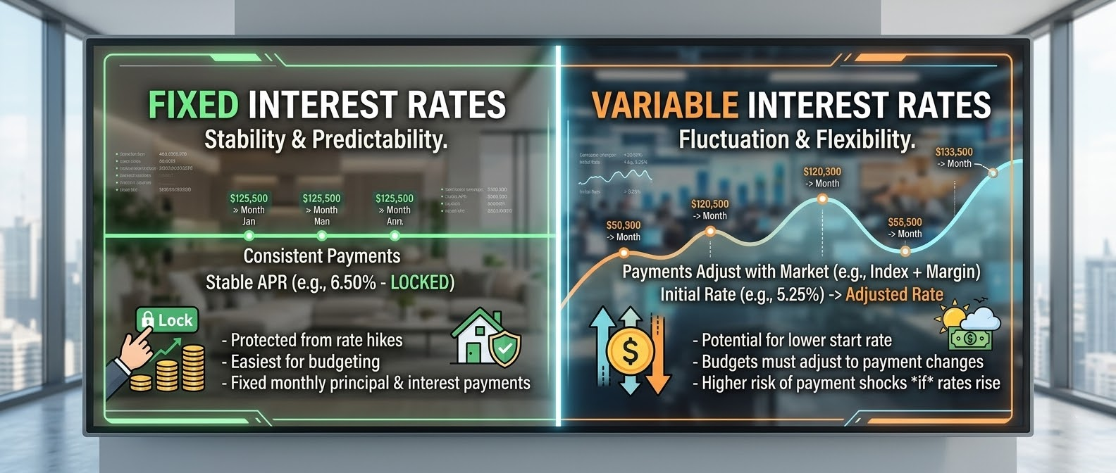 Variable Interest Rates: These fluctuate based on market benchmarks (like the SOFR). While they may start lower than fixed rates, they can increase over time, making your monthly payments unpredictable.